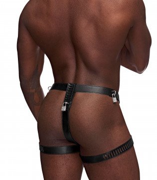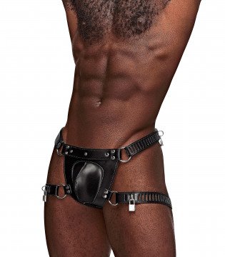 Scorpio Chastity Thong features adjustable waist, leg, and t-back straps secured with locks & keys. Soft stretch leather pouch and attached heavy metal rings.