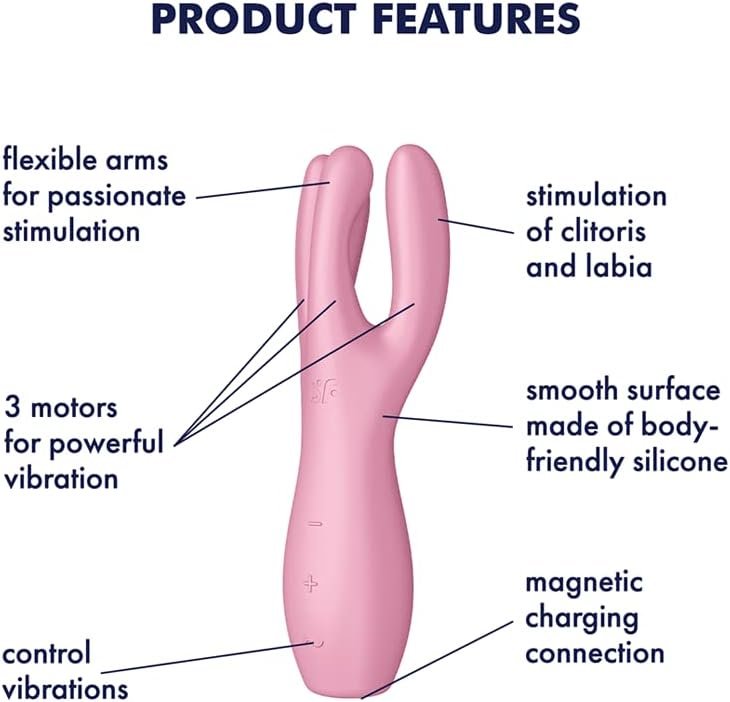 The Threesome 3 lay-on vibrator provides sensual, broad-area clitoral and labia stimulation: It is ergonomically shaped with 3 rounded arms, each of which houses a powerful motor. The two outer arms pamper the labia while the middle arm rests centered on the clitoris and can be pushed down for intensified stimulation. The vibrations of the outer and inner arms can be controlled separately. You can explore  and flexibly combine them with one another.